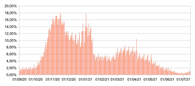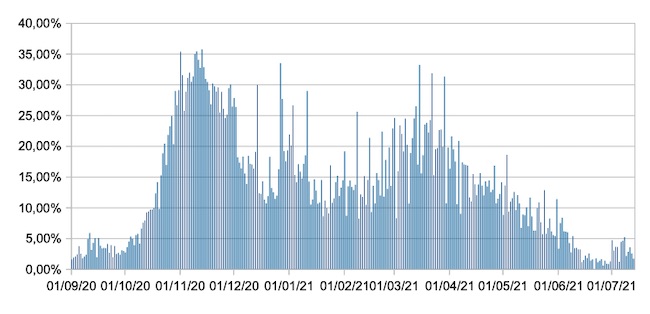 Il grafico mostra la percentuale di tamponi positivi giornalieri su tamponi giornalieri testati ( diagnostici+quelli di controllo) nel periodo 1 settembre 2020 – 13 luglio 2021 in Italia.