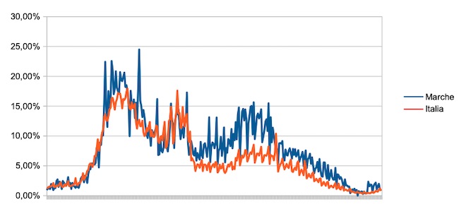 Il grafico seguente illustra l’andamento della percentuale giornaliera di nuovi casi positivi rispetto al corrispondente numero di tamponi (diagnostici +quelli di controllo) effettuati a livello nazionale e nella regione Marche nel periodo 1 settembre 2020 – 13 luglio 2021.