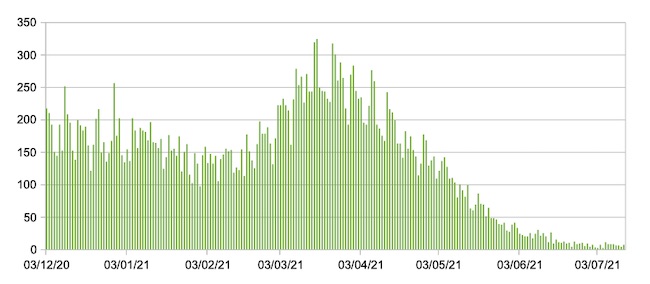 Attraverso i dati della Regione , i contenuti e i grafici di MarcheNews24.it, andiamo ora a esaminare l’andamento dei contagi Covid 19 di oggi, martedì 13 luglio 2021.I risultati dei test delle ultime 24 ore sono i seguenti: 21 casi positivi su 1254 tamponi, nel percorso nuove diagnosi, con una incidenza di 1,7% (ieri 2,5%) di positivi rispetto a quelli giornalieri testati. L’incidenza odierna dei nuovi positivi nelle Marche sul totale di 2381 tamponi (diagnostici+quelli di controllo) è di 0,9 %(ieri 1,1%).