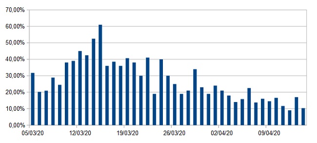 Il grafico sull’andamento dei contagi giornalieri nelle Marche nel periodo 4 marzo – 14 aprile 2020.
