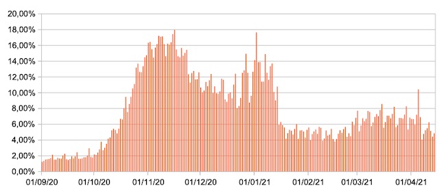 Il grafico mostra la percentuale di tamponi positivi giornalieri su tamponi giornalieri testati ( diagnostici+quelli di controllo) nel periodo 1 settembre 2020 – 14 aprile 2021 in Italia.
