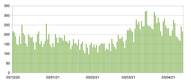 Il grafico seguente mostra i dati giornalieri relativi ai nuovi ingressi in terapia intensiva nelle Marche 3 dicembre 2020 – 14 aprile 2021.