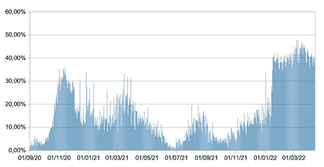 Il grafico mostra la percentuale di tamponi positivi giornalieri su tamponi giornalieri testati ( diagnostici+quelli di controllo) nel periodo 1 settembre 2020 –14 aprile 2022 in Italia.