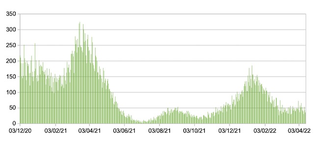 Il grafico seguente mostra i dati giornalieri relativi ai nuovi ingressi in terapia intensiva nelle Marche 3 dicembre 2020 – 14 aprile 2022.