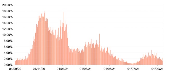 Il grafico mostra la percentuale di tamponi positivi giornalieri su tamponi giornalieri testati ( diagnostici+quelli di controllo) nel periodo 1 settembre 2020 –14 settembre 2021 in Italia.