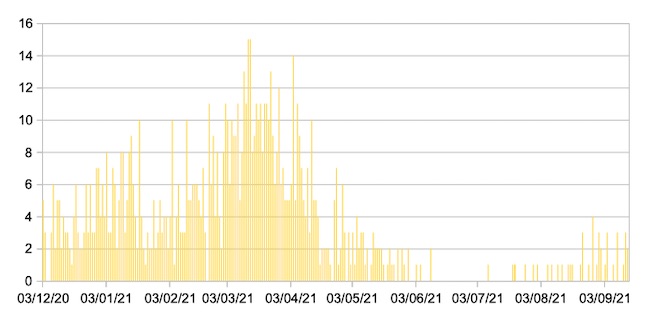 Secondo la rilevazione giornaliera del Ministero della Salute la percentuale di Posti Letto di Terapia Intensiva occupata da Pazienti Covid−19 nelle Marche ,in data 14 settembre 2021, è del 13%, in Italia è del 6%.La percentuale di Posti Letto in area non critica occupata da Pazienti Covid−19 nelle Marche è del 6% , in Italia del 7%.Il grafico seguente mostra i dati giornalieri relativi ai nuovi ingressi in terapia intensiva nelle Marche 3 dicembre 2020 – 14 settembre 2021.