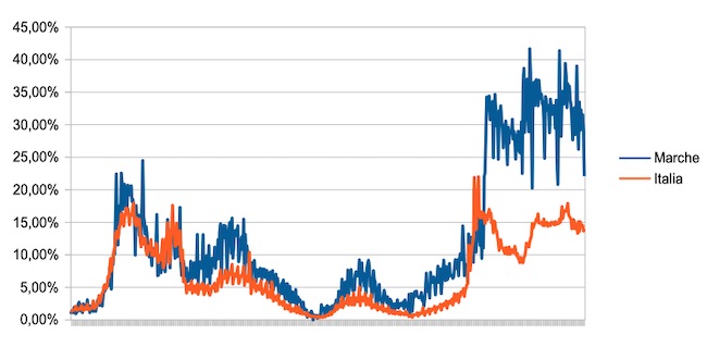 Il grafico seguente illustra l’andamento della percentuale giornaliera di nuovi casi positivi rispetto al corrispondente numero di tamponi (diagnostici +quelli di controllo) effettuati a livello nazionale e nella regione Marche nel periodo 1 settembre 2020 – 15 maggio 2022.