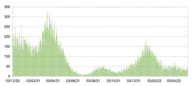 Nel grafico sono riportati i valori medi settimanali.Il valore medio della settimana 8/5/22-14/5/22 è 599,81 (la scorsa settimana era 702,39).