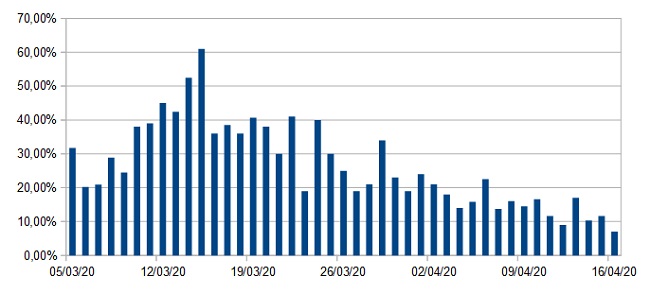 Il grafico sull’andamento dei contagi giornalieri nelle Marche nel periodo 4 marzo – 16 aprile 2020.