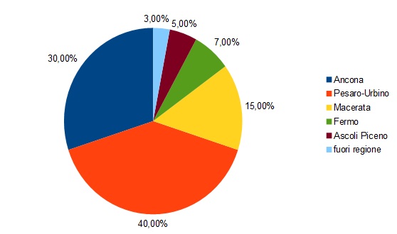 Del totale dei casi positivi 1664 si riferiscono alla provincia di Ancona,2249 a quella di Pesaro-Urbino ,la più colpita, 871 alla provincia di Macerata,378 a quella di Fermo,266 a quella di Ascoli Piceno .Il servizio sanitario regionale delle Marche segue anche 154 casi fuori regione.