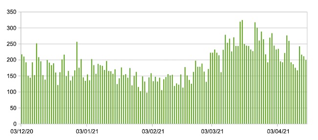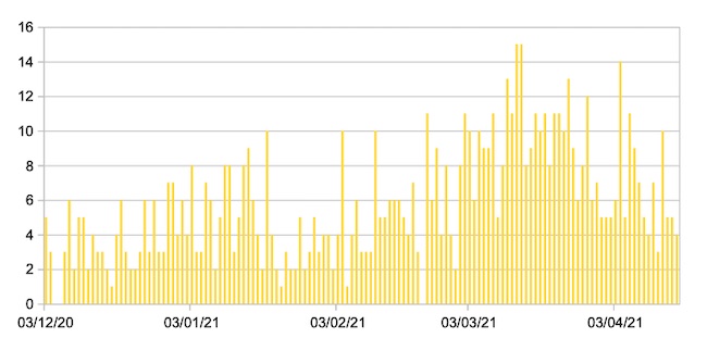 Il grafico seguente mostra i dati giornalieri relativi ai nuovi ingressi in terapia intensiva nelle Marche 3 dicembre 2020 – 16 aprile 2021.