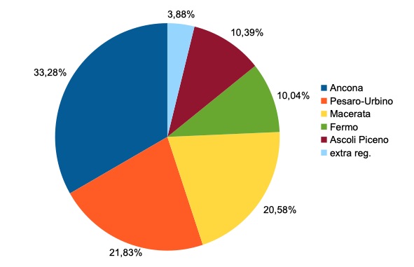 Del totale dei casi positivi 31.247 si riferiscono alla provincia di Ancona, 20.496 a quella di Pesaro-Urbino ,19.316 alla provincia di Macerata,9.427 a quella di Fermo, 9.751 a quella di Ascoli Piceno. Il servizio sanitario regionale delle Marche segue anche 3.645 casi fuori regione.