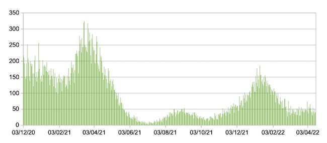 Il grafico seguente mostra i dati giornalieri relativi ai nuovi ingressi in terapia intensiva nelle Marche 3 dicembre 2020 – 16 aprile 2022.