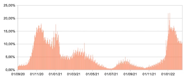 Il grafico mostra la percentuale di tamponi positivi giornalieri su tamponi giornalieri testati ( diagnostici+quelli di controllo) nel periodo 1 settembre 2020 – 16 febbraio 2022 in Italia.