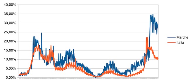 Il grafico seguente illustra l’andamento della percentuale giornaliera di nuovi casi positivi rispetto al corrispondente numero di tamponi (diagnostici +quelli di controllo) effettuati a livello nazionale e nella regione Marche nel periodo 1 settembre 2020 – 16 febbraio 2022.