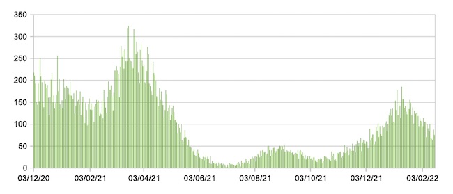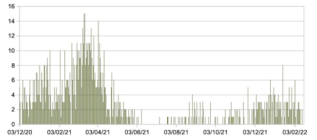 Nel grafico sono riportati i valori medi settimanali.Il valore medio della settimana 06/02/22-12/02/22 è 1436,87 (la scorsa settimana era 2.218,82):netta discesa della curva in due settimane.