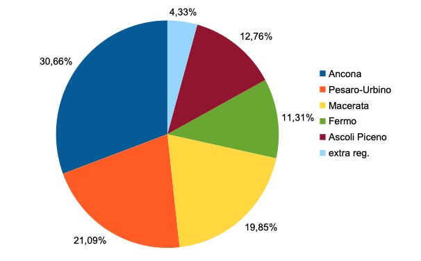 676 in provincia di Ancona,354 in provincia di Pesaro-Urbino,514 nella provincia di Macerata,254 nella provincia di Fermo,309 nella provincia di Ascoli Piceno,97 residenti fuori regione.