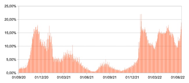 Il grafico mostra la percentuale di tamponi positivi giornalieri su tamponi giornalieri testati ( diagnostici+quelli di controllo) nel periodo 1 settembre 2020 – 16 giugno 2022 in Italia.