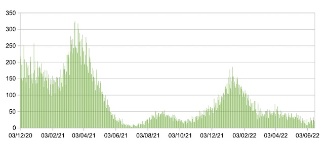 Sale rispetto a ieri il tasso di positività giornaliero; in questo periodo comunque si registrano valori più alti dello stesso rispetto allo scorso anno; il valore odierno ad esempio è 27 volte maggiore di quello del giorno 16/06/21.