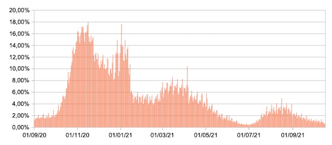 Il grafico mostra la percentuale di tamponi positivi giornalieri su tamponi giornalieri testati ( diagnostici+quelli di controllo) nel periodo 1 settembre 2020 – 16 ottobre 2021 in Italia.