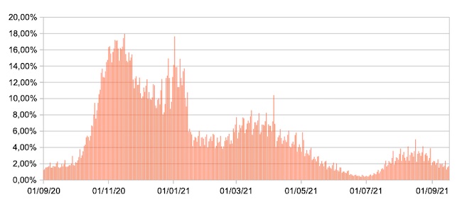 Il grafico mostra la percentuale di tamponi positivi giornalieri su tamponi giornalieri testati ( diagnostici+quelli di controllo) nel periodo 1 settembre 2020 –16 settembre 2021 in Italia.