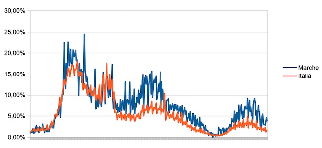 Il grafico seguente illustra l’andamento della percentuale giornaliera di nuovi casi positivi rispetto al corrispondente numero di tamponi (diagnostici +quelli di controllo) effettuati a livello nazionale e nella regione Marche nel periodo 1 settembre 2020 – 16 settembre 2021.