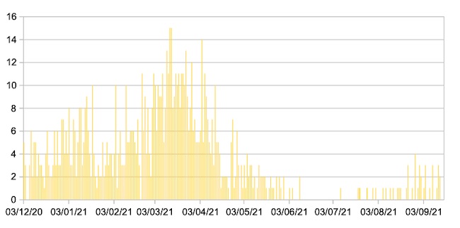 Secondo la rilevazione giornaliera del Ministero della Salute la percentuale di Posti Letto di Terapia Intensiva occupata da Pazienti Covid−19 nelle Marche ,in data 16 settembre 2021, è del 13%, in Italia è del 6%.La percentuale di Posti Letto in area non critica occupata da Pazienti Covid−19 nelle Marche è del 6% , in Italia del 7%.Il grafico seguente mostra i dati giornalieri relativi ai nuovi ingressi in terapia intensiva nelle Marche 3 dicembre 2020 – 16 settembre 2021.
