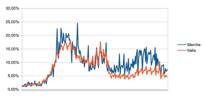 Il grafico seguente illustra l’andamento della percentuale giornaliera di nuovi casi positivi rispetto al corrispondente numero di tamponi (diagnostici +quelli di controllo) effettuati a livello nazionale e nella regione Marche nel periodo 1 settembre 2020 – 17 aprile 2021.