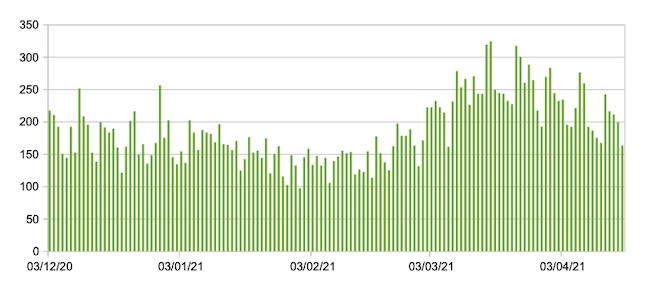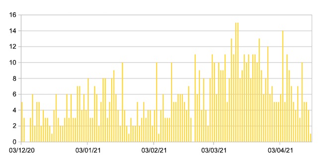 Il grafico seguente mostra i dati giornalieri relativi ai nuovi ingressi in terapia intensiva nelle Marche 3 dicembre 2020 – 17 aprile 2021.