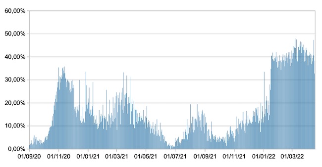 Il grafico mostra la percentuale di tamponi positivi giornalieri su tamponi giornalieri testati ( diagnostici+quelli di controllo) nel periodo 1 settembre 2020 –17 aprile 2022 in Italia.