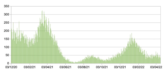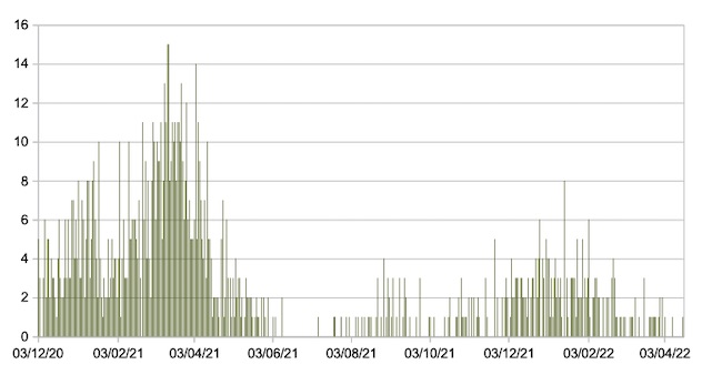 Il grafico seguente mostra i dati giornalieri relativi ai nuovi ingressi in terapia intensiva nelle Marche 3 dicembre 2020 – 17 aprile 2022.