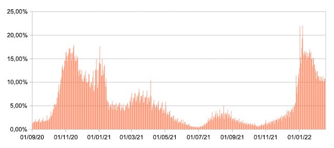 Il grafico mostra la percentuale di tamponi positivi giornalieri su tamponi giornalieri testati ( diagnostici+quelli di controllo) nel periodo 1 settembre 2020 – 17 febbraio 2022 in Italia.
