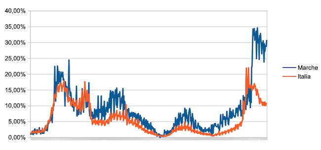 Il grafico seguente illustra l’andamento della percentuale giornaliera di nuovi casi positivi rispetto al corrispondente numero di tamponi (diagnostici +quelli di controllo) effettuati a livello nazionale e nella regione Marche nel periodo 1 settembre 2020 – 17 febbraio 2022.