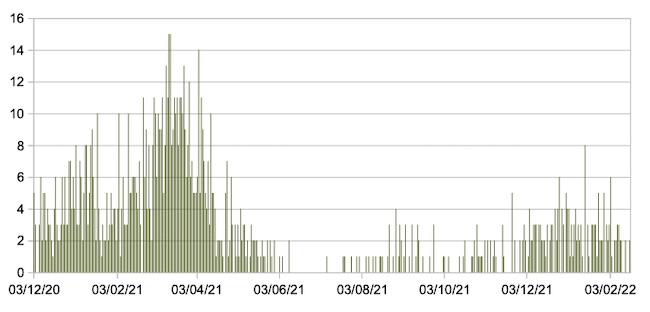 Il grafico seguente mostra i dati giornalieri relativi ai nuovi ingressi in terapia intensiva nelle Marche 3 dicembre 2020 – 17 febbraio 2022.