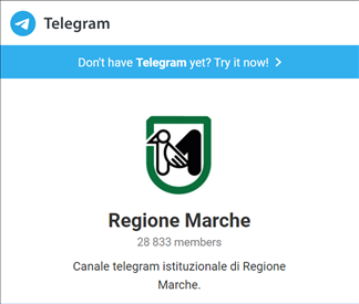 Per collegarsi occorre scaricare l’App Telegram (su Google play per smartphone o tablet Android o su App store per dispositivi Apple IOS Ipad/Iphone), cercare “Regione Marche” o @regione_marche e cliccare sul pulsante “Unisciti” oppure usare il link https://t.me/regione_marche.