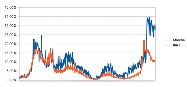 Il grafico seguente illustra l’andamento della percentuale giornaliera di nuovi casi positivi rispetto al corrispondente numero di tamponi (diagnostici +quelli di controllo) effettuati a livello nazionale e nella regione Marche nel periodo 1 settembre 2020 – 18 febbraio 2022.
