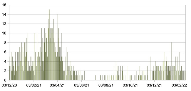Nel grafico sono riportati i valori medi settimanali.Il valore medio della settimana 06/02/22-12/02/22 è 1436,87 (la scorsa settimana era 2.218,82):netta discesa della curva in due settimane.