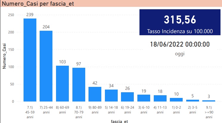 Dal bollettino quotidiano di oggi, 18 giugno 2022, del Ministero della Salute emergono i seguenti dati relativi all’Italia.Sono 34.978 i nuovi positivi nelle ultime 24 ore , per un totale di 17.844.905 da inizio pandemia.I tamponi effettuati nelle ultime 24 ore sono 193.040 complessivi ( test molecolari + test rapidi antigenici). L’incidenza del numero di persone risultate positive rispetto al numero giornaliero di tamponi effettuati è del 18,1% (ieri 19,1%).