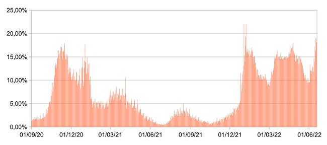Il grafico mostra la percentuale di tamponi positivi giornalieri su tamponi giornalieri testati ( diagnostici+quelli di controllo) nel periodo 1 settembre 2020 – 18 giugno 2022 in Italia.