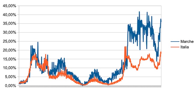 Il grafico seguente illustra l’andamento della percentuale giornaliera di nuovi casi positivi rispetto al corrispondente numero di tamponi effettuati a livello nazionale e nella regione Marche nel periodo 1 settembre 2020 – 18 giugno 2022.Il valore odierno nelle Marche è 31 volte maggiore di quello del giorno 18/06/21.