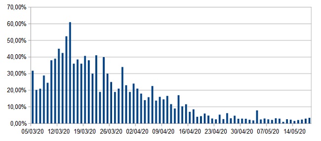 Dopo il brusco aumento dei contagi del 4 maggio per altro motivato dal fatto che tale dato relativo ai tamponi raggruppava casi del 29, del 30 aprile, dell’1 e del 2 maggio, i valori degli ultimi giorni rientrano nell’ottica del rallentamento della curva epidemiologica. Dal 18 aprile infatti gli incrementi giornalieri oscillano dall’1% al 6% segno che il contagio sta perdendo vigore. Altri segnali significativi di una tendenza positiva vengono dal numero di dimessi/guariti che cresce di giorno in giorno e dal calo di terapie intensive e nuovi ricoveri.Siamo sulla strada giusta,ma bisogna continuare a rispettare regole e restrizioni affinché si possano avere risultati sempre più confortanti.