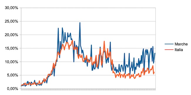 Il grafico seguente illustra l’andamento della percentuale giornaliera di nuovi casi positivi rispetto al corrispondente numero di tamponi (diagnostici +quelli di controllo) effettuati a livello nazionale e nella regione Marche nel periodo 1 settembre 2020 – 18 marzo 2021.