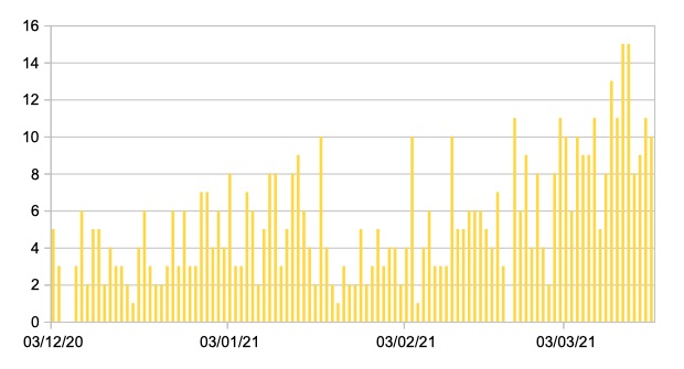 Il grafico seguente mostra i dati giornalieri relativi ai nuovi ingressi in terapia intensiva nelle Marche 3 dicembre 2020 – 18 marzo 2021.