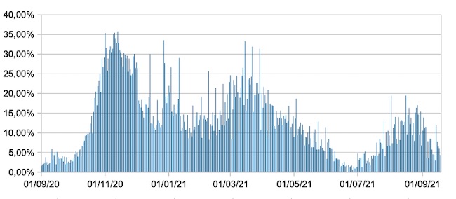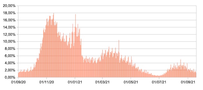 Il grafico mostra la percentuale di tamponi positivi giornalieri su tamponi giornalieri testati ( diagnostici+quelli di controllo) nel periodo 1 settembre 2020 –18 settembre 2021 in Italia.
