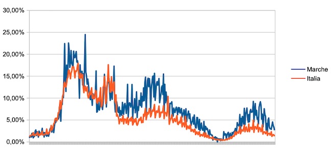 Il grafico seguente illustra l’andamento della percentuale giornaliera di nuovi casi positivi rispetto al corrispondente numero di tamponi (diagnostici +quelli di controllo) effettuati a livello nazionale e nella regione Marche nel periodo 1 settembre 2020 – 18 settembre 2021.