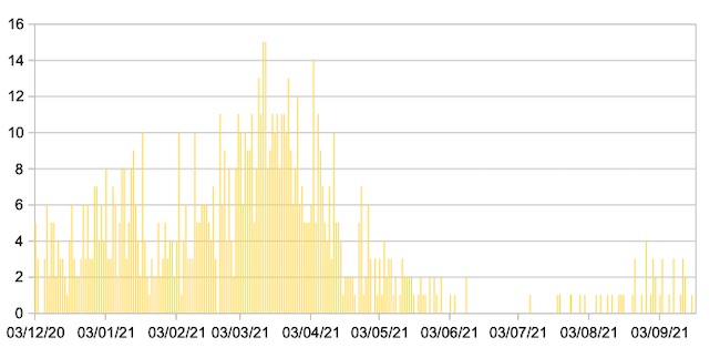 Secondo la rilevazione giornaliera del Ministero della Salute la percentuale di Posti Letto di Terapia Intensiva occupata da Pazienti Covid−19 nelle Marche ,in data 18 settembre 2021, è del 10%, in Italia è del 6%.La percentuale di Posti Letto in area non critica occupata da Pazienti Covid−19 nelle Marche è del 6% , in Italia del 7%.Il grafico seguente mostra i dati giornalieri relativi ai nuovi ingressi in terapia intensiva nelle Marche 3 dicembre 2020 – 18 settembre 2021.