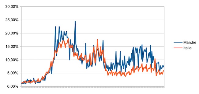 Il grafico seguente illustra l’andamento della percentuale giornaliera di nuovi casi positivi rispetto al corrispondente numero di tamponi (diagnostici +quelli di controllo) effettuati a livello nazionale e nella regione Marche nel periodo 1 settembre 2020 – 19 aprile 2021.