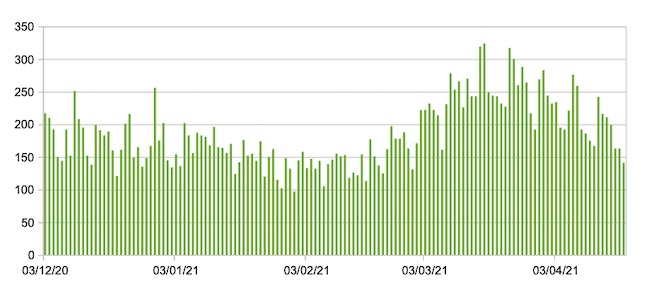 Il grafico seguente mostra i dati giornalieri relativi ai nuovi ingressi in terapia intensiva nelle Marche 3 dicembre 2020 – 19 aprile 2021.