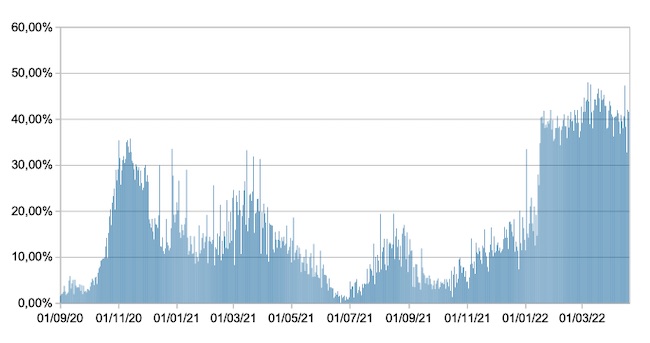 Il grafico mostra la percentuale di tamponi positivi giornalieri su tamponi giornalieri testati ( diagnostici+quelli di controllo) nel periodo 1 settembre 2020 –19 aprile 2022 in Italia.