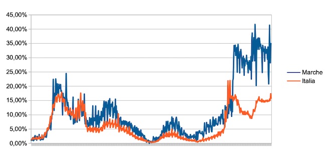 Il grafico seguente illustra l’andamento della percentuale giornaliera di nuovi casi positivi rispetto al corrispondente numero di tamponi (diagnostici +quelli di controllo) effettuati a livello nazionale e nella regione Marche nel periodo 1 settembre 2020 – 19 aprile 2022.